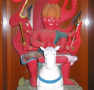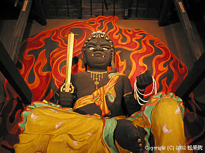 開山以来、神仏混交の修験道を修し、御本尊は不動明王であり、 開山四百周年の砌、現住職自ら二十一日間断食修行の荒行において21万枚の願いが書かれた 護摩木を焚き上げた末、 その灰を不動尊の御身に塗り込めた世界最大の塑像を本尊としております。また、開山当時より、開運の神として秘佛の大聖歓喜天を奉安しております。