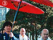当日の朝10時より、お聖天さまに捧げる“献膳大根行列”(写真1~3)が、100メートルの長さで松景院の門前町にあたる小牛田町中埣の町区を練り歩き山内に到着すると、馬頭観音堂の前で落慶式が行われました。(写真5)